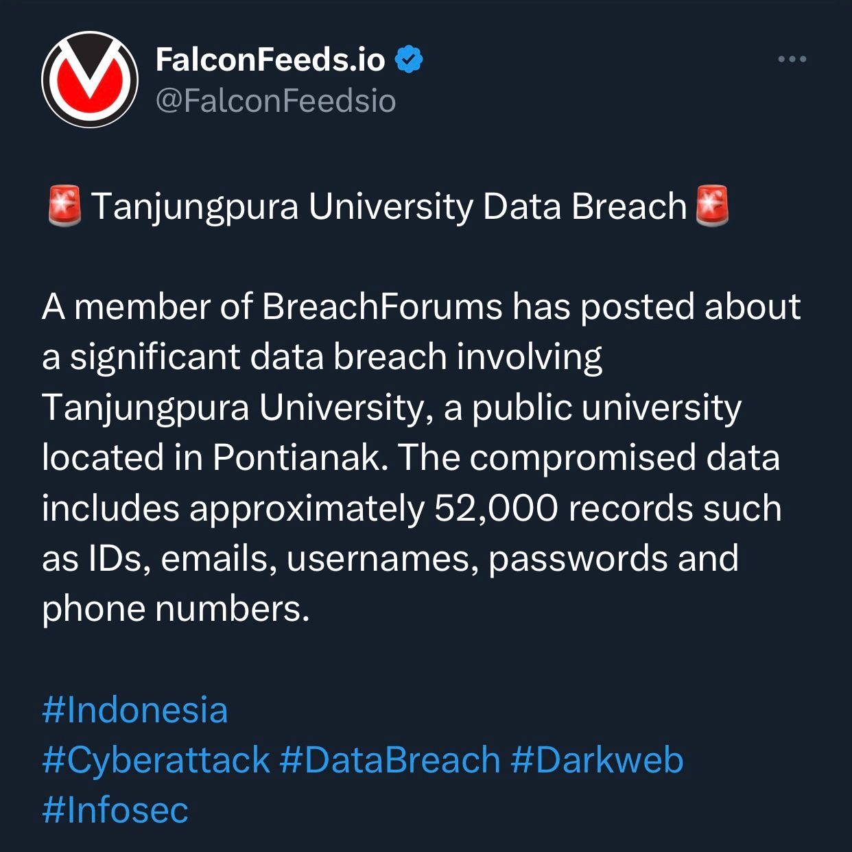 Dalam postingan yang dibagikan pada Senin, 8 Juli 2024, akun Falcon Feed mengklaim telah menguasai 52.000 data milik Untan, mencakup ID, email, nama pengguna, kata sandi, dan nomor telepon.