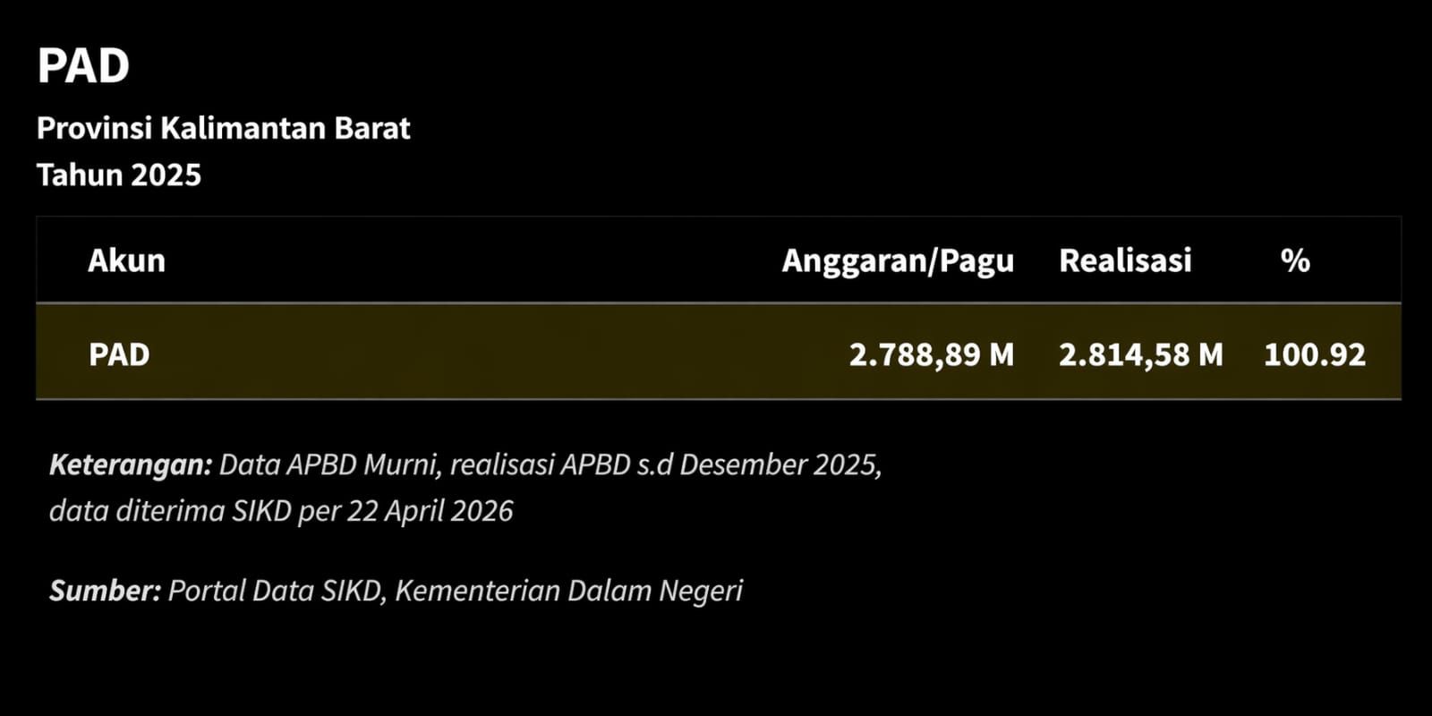 Beritesambas.com - Pemerintah Provinsi Kalimantan Barat kembali mencatatkan capaian positif dalam pengelolaan keuangan daerah. Pendapatan Asli Daerah (PAD) berhasil melampaui target dengan realisasi sebesar Rp2,81 triliun atau 100,92 persen dari pagu Rp2,78 triliun, sebagaimana tercatat dalam data Kementerian Keuangan RI.
